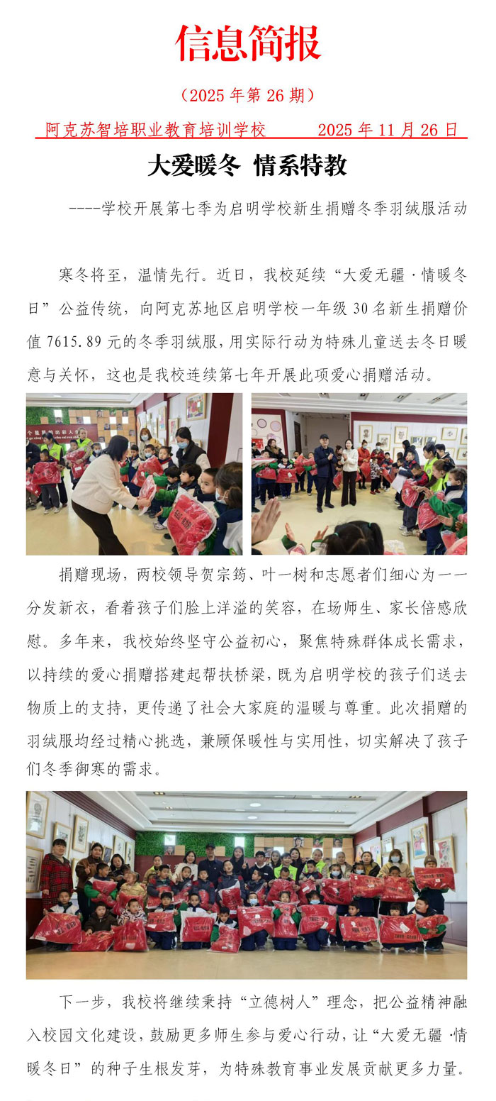 智培公益-阿克苏智培学校开展第七季“大爱无疆·情暖冬日”羽绒服捐赠活动