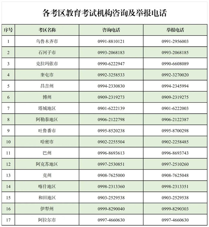 各考区教育考试机构报名相关政策咨询及举报电话(附后)
